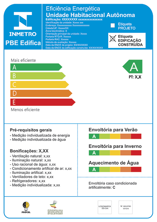 Etiqueta Nacional de Conservação de Energia (ENCE), de Unidade Habitacional Autônoma, incluindo avaliação dos sistemas da envoltória para verão, envoltória para inverno e aquecimento de água. |