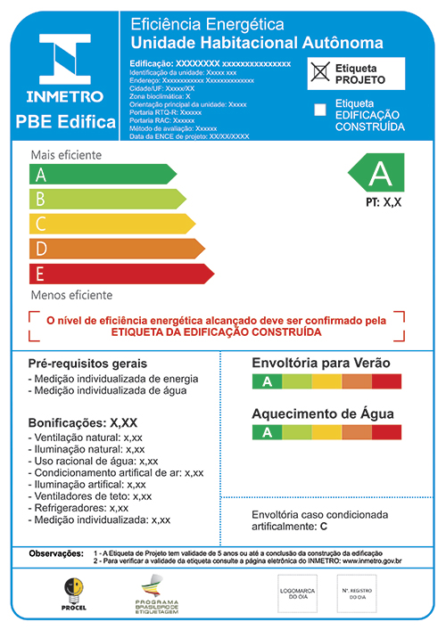 Etiqueta Nacional de Conservação de Energia (ENCE), de Unidade Habitacional Autônoma, incluindo avaliação dos sistemas da envoltória para verão e aquecimento de água. |